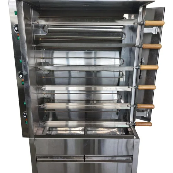 Metal Supreme Rotisserie Oven, electric, (4) stainless steel V spit skewers, (20) chicken capacity, (20) chickens/hr average productivity, tempered-glass sliding doors, stainless steel front, sides & interior cavity, (2) stainless steel grease drawers, 3? casters, 220v/60/1-ph, 32 amps, 6,000 watts. 1 years parts & 1 year labor warranty, standard.