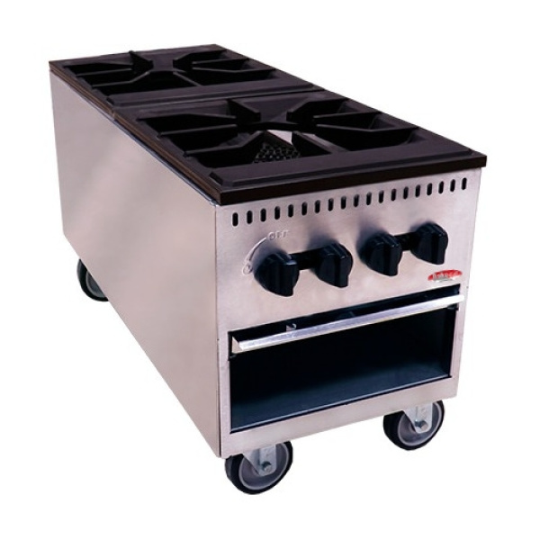 Single Burner Stock Pot, 3-ring burner, drip pan, independent control for each burner, 6″ legs, 18″ x 21″ cast iron grates, gas conversion kit included, 90,000 BTU, cULus, UL EPH Classified. 2 Year parts and 1 Year labor warranty