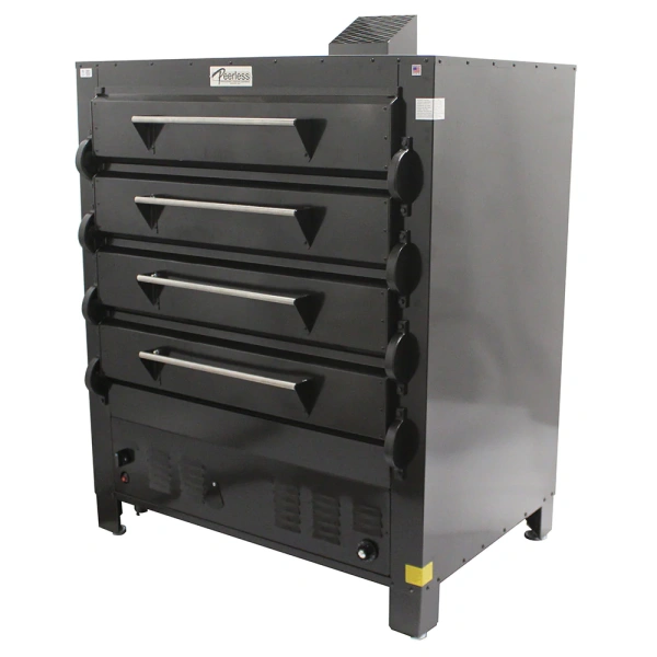 Pizza Oven, deck-type, gas, 42″W x 32″D stone deck interiors, (4) 7.5″ high sections, throttling thermostat, 300?F to 650?F temperature range, (6) steel tubular burners, pizza stones, aluminized interior, black enamel finish, stainless steel doors, adjustable legs, 96,000 BTU, cETLus, ETL-Sanitation. One year limited parts & labor warranty, standard