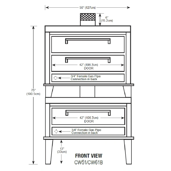 Bake Oven, deck-type, gas, 42″W x 32″D steel deck interior, (1) 12″ high section, throttling thermostat, 250?F to 550?F temperature range, “Power-Pak” 4-cell burner system, NO pizza stones, aluminized interior, enamel finish, stainless steel front, adjustable legs, 60,000 BTU, cETLus, ETL-Sanitation. One year limited parts & labor warranty, standard